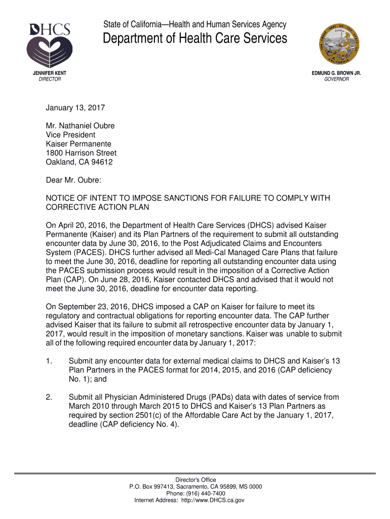 State of CaliforniaHealth and Human Services Agency Department of Health Care Services JENNIFER KENT DIRECTOR EDMUND G. BROWN JR. GOVERNOR January 13, 2017, Mr. Nathaniel Outré Vice President Kaiser