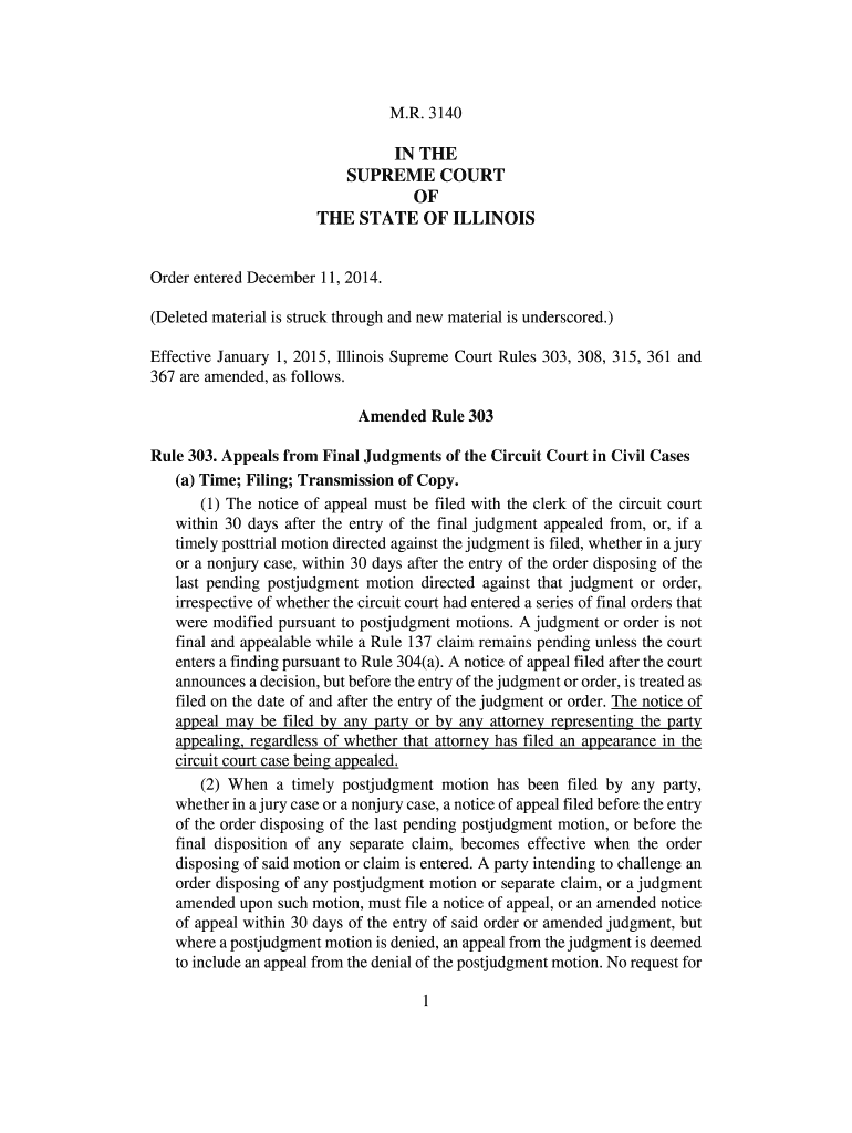 M.R. 3140 IN THE SUPREME COURT OF THE STATE OF ILLINOIS Order entered December 11, 2014. (Deleted material is struck through and new material is underscored.) Effective January 1, 2015, Illinois Supreme