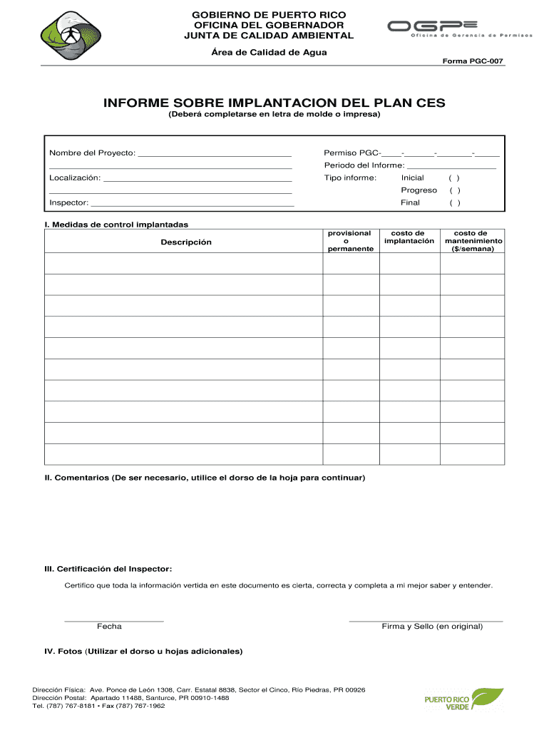 GOBIERNO DE PUERTO RICO OFICINA DEL GOBERNADOR JUNTA DE CALIDAD AMBIENTAL rea de Calidad de Agua Forma PGC-007 INFORME SOBRE IMPLANTACION DEL PLAN CES Deber completarse en letra de molde o impresa Nombre del Proyecto Permiso PGC---- Periodo del Informe Localizaci n Tipo informe Inicial Progreso Inspector Final I. Medidas de control implantadas Descripci n provisional o permanente costo de implantaci n mantenimiento /semana II. Comentarios De ser necesario utilice el dorso de la hoja para...