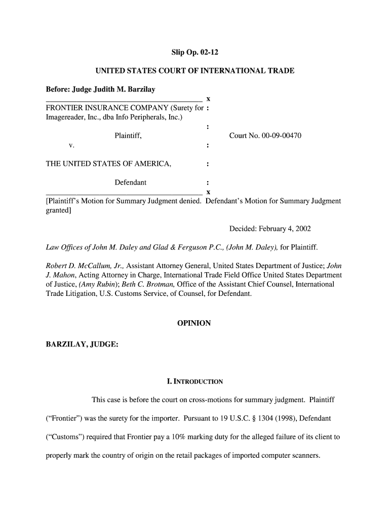 Get the free 02-12 UNITED STATES COURT OF INTERNATIONAL TRADE Before: Judge Judith M - cit uscourts
