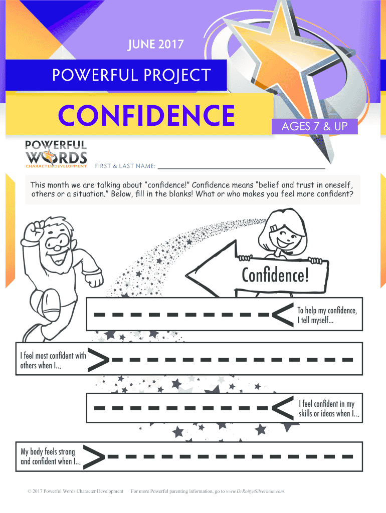 JUNE 2017 POWERFUL PROJECT CONFIDENCE AGES 7 & UP FIRST & L AST NAME: This month we are talking about confidence! Confidence means belief and trust in oneself, others or a situation. Below, fill in