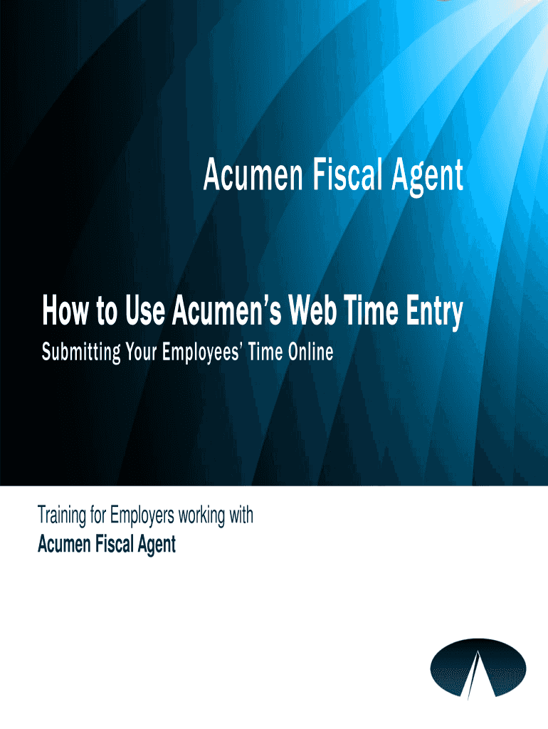 Acumen Fiscal Agent How to Use Acumen Web Time Entry Submitting Your Employees Time Online Training for Employers working with Acumen Fiscal Agent Introduction Web Time Entry can be accessed anywhere