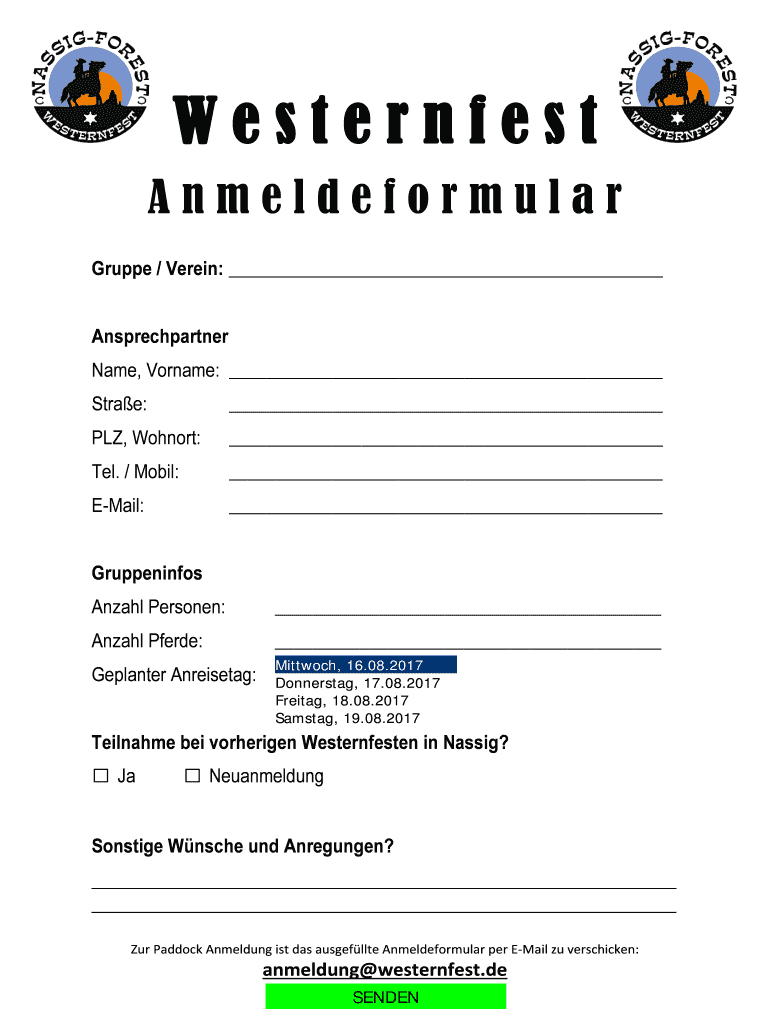 Western fest Anmeldeformular Grippe / Vain: Ansprechpartner Name, Surname: Straw: PLY, Cohort: Tel. / Mobil: Email: Gruppeninfos Anzac Personen: Anzac Pierre: Ge planter Anreisetag: Mitch, 16.08.2017
