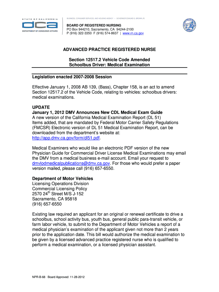 BUSINESS, CONSUMER SERVICES, AND HOUSING AGENCY GOVERNOR EDMUND G. BROWN JR. BOARD OF REGISTERED NURSING PO Box 944210, Sacramento, CA 942442100 P (916) 3223350 F (916) 5748637 www.rn.ca.gov ADVANCED