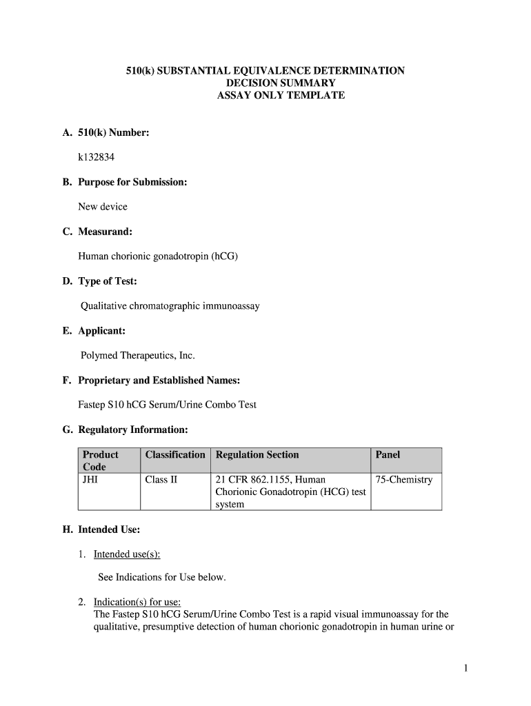 510(k) SUBSTANTIAL EQUIVALENCE DETERMINATION DECISION SUMMARY ASSAY ONLY TEMPLATE A. 510(k) Number: k132834 B. Purpose for Submission: New device C. Measured: Human chorionic gonadotropin (HCG) D.
