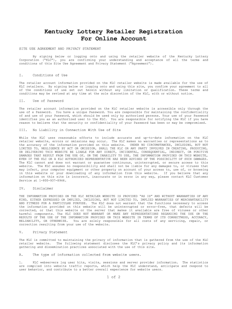 Kentucky Lottery Retailer Registration For Online Account SITE USE AGREEMENT AND PRIVACY STATEMENT By signing below or logging onto and using the retailer website of the Kentucky Lottery Corporation