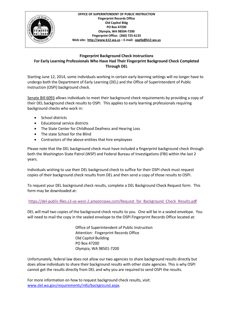 OFFICE OF SUPERINTENDENT OF PUBLIC INSTRUCTION Fingerprint Records Office Old Capitol Bldg PO Box 47200 Olympia, WA 985047200 Fingerprint Office: (360) 7256135 Website: http://www.k12.wa.us Email: