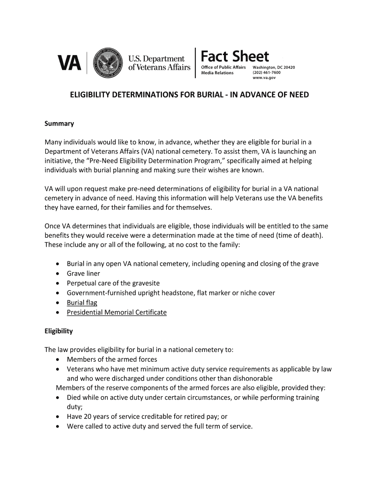 The Veterans spouse minor children and under certain conditions dependent unmarried adult children are eligible for burial even if they predecease the eligible Veteran. Applying for Benefits VA encourages Veterans and their spouses to apply for a pre-need burial eligibility determination. Authorized representatives can also apply on behalf of eligible claimants. VA will confirm the pre-need eligibility Because laws and personal circumstances change VA will validate the pre-need decision using...