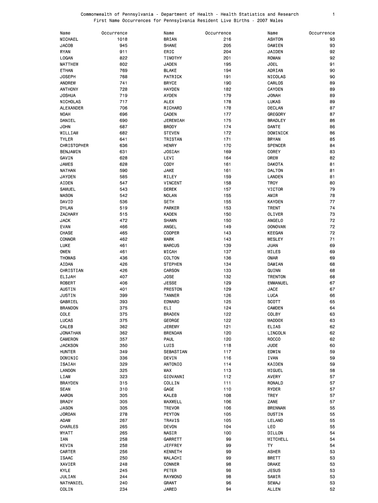 Commonwealth of Pennsylvania - Department of Health - Health Statistics and Research First Name Occurrences for Pennsylvania Resident Live Births - 2007 Males Name MICHAEL JACOB RYAN LOGAN MATTHEW ETHAN JOSEPH ANDREW ANTHONY JOSHUA NICHOLAS ALEXANDER NOAH DANIEL JOHN WILLIAM TYLER CHRISTOPHER BENJAMIN GAVIN JAMES NATHAN JAYDEN AIDEN SAMUEL MASON DAVID DYLAN ZACHARY JACK EVAN CHASE CONNOR LUKE OWEN THOMAS AIDAN CHRISTIAN ELIJAH ROBERT AUSTIN GABRIEL BRANDON COLE LUCAS CALEB CAMERON JACKSON...