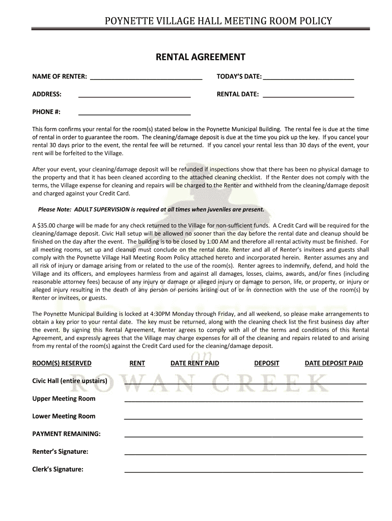 Renter and all of Renter s invitees and guests shall comply with the Poynette Village Hall Meeting Room Policy attached hereto and incorporated herein. Renter assumes any and all risk of injury or damage arising from or related to the use of the room s. POYNETTE VILLAGE HALL MEETING ROOM POLICY RENTAL AGREEMENT NAME OF RENTER TODAY S DATE ADDRESS RENTAL DATE PHONE This form confirms your rental for the room s stated below in the Poynette Municipal Building. The Poynette Municipal Building is...
