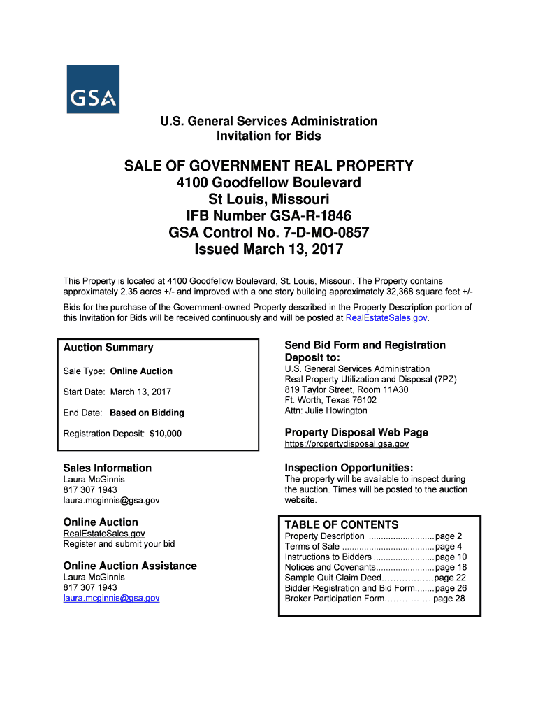 U.S. General Services Administration Invitation for Bids SALE OF GOVERNMENT REAL PROPERTY 4100 Goodfellow Boulevard St Louis Missouri IFB Number GSA-R-1846 GSA Control No. 7-D-MO-0857 Issued March 13 2017 This Property is located at 4100 Goodfellow Boulevard St. Louis Missouri. GSA reserves the right to change the online terms and conditions. A previously registered bidder of GSAAuctions. IFB Issue Date 03/13/17 Page 2 of 29 IFB No. GSA-R-1846 d. Any survey discrepancies conflicts or...
