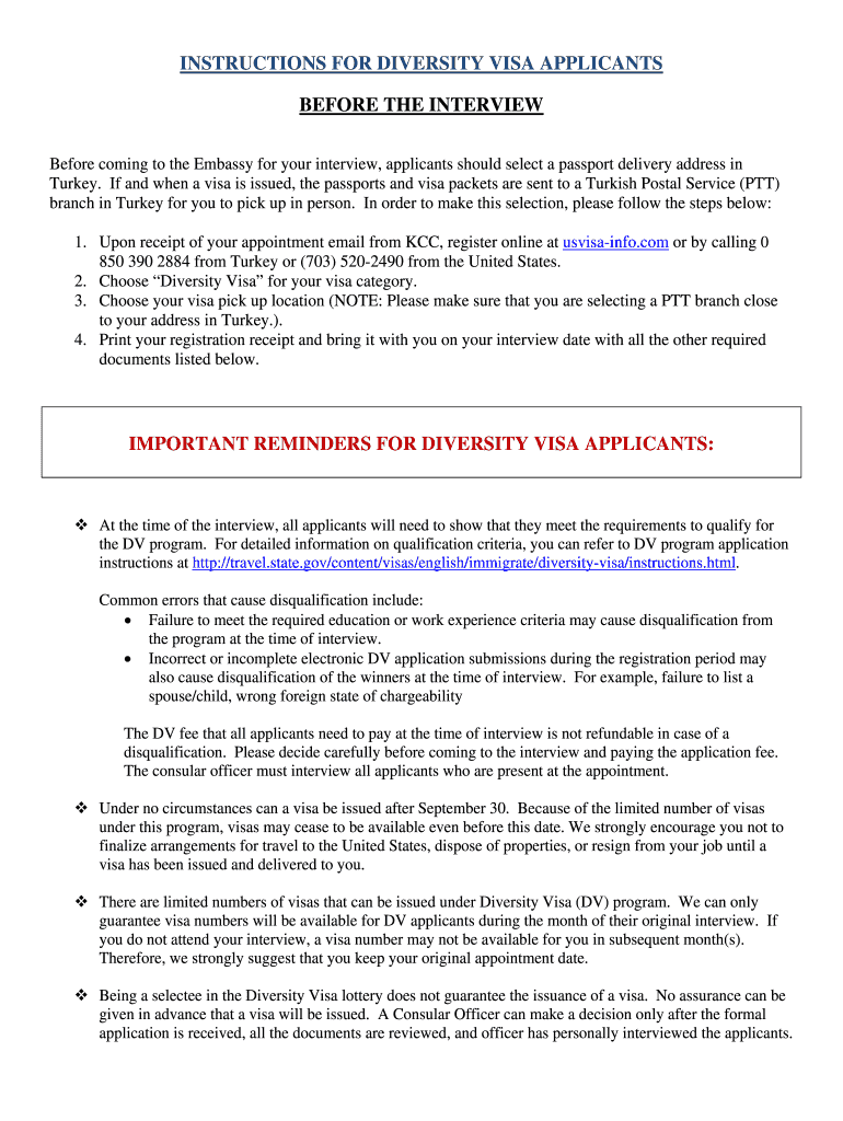 DV applicants are subject to all grounds of ineligibility for immigrant visas specified in the Immigration and Nationality Act INA. It is not possible to correct your Foreign State of Charability after registering for the DV lottery. Onetonline. org/ will be used to determine qualifying work experience. DV2016 Instructions and Frequently Asked Questions English Turkish Farsi REQUIRED DOCUMENTS AT THE INTERVIEW 1. There are no special provisions for the waiver of any ground of visa...