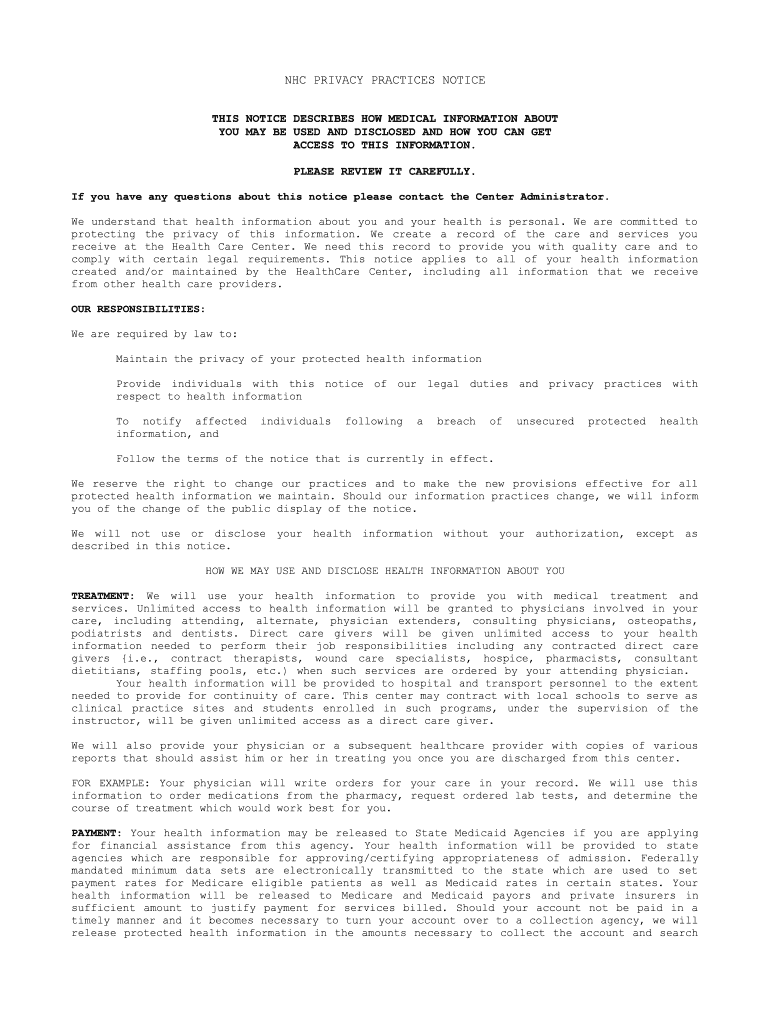The NHC privacy practices notice outlines how the organization handles and protects patient information.