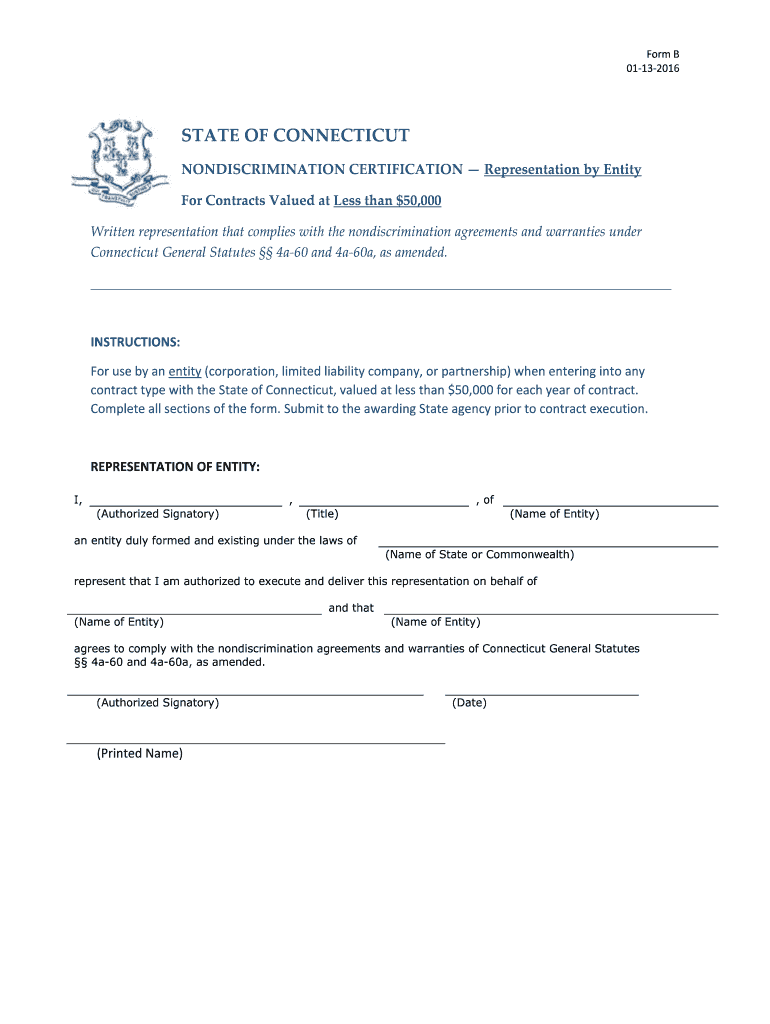 Form B 01-13-2016 STATE OF CONNECTICUT NONDISCRIMINATION CERTIFICATION Representation by Entity For Contracts Valued at Less than 50 000 Written representation that complies with the nondiscrimination agreements and warranties under Connecticut General Statutes 4a-60 and 4a-60a as amended. INSTRUCTIONS For use by an entity corporation limited liability company or partnership when entering into any contract type with the State of Connecticut valued at less than 50 000 for each year of...