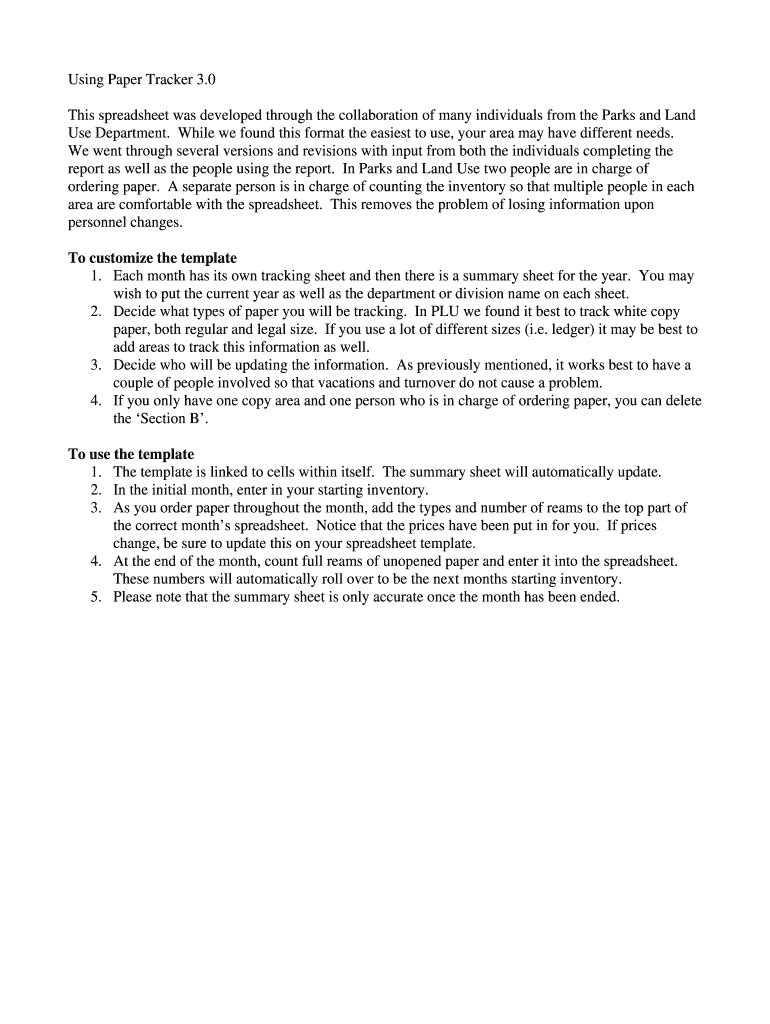 This removes the problem of losing information upon personnel changes. To customize the template 1. To use the template 1. The template is linked to cells within itself. The summary sheet will automatically update. Using Paper Tracker 3. 0 This spreadsheet was developed through the collaboration of many individuals from the Parks and Land Use Department. While we found this format the easiest to use your area may have different needs. We went through several versions and revisions with input...