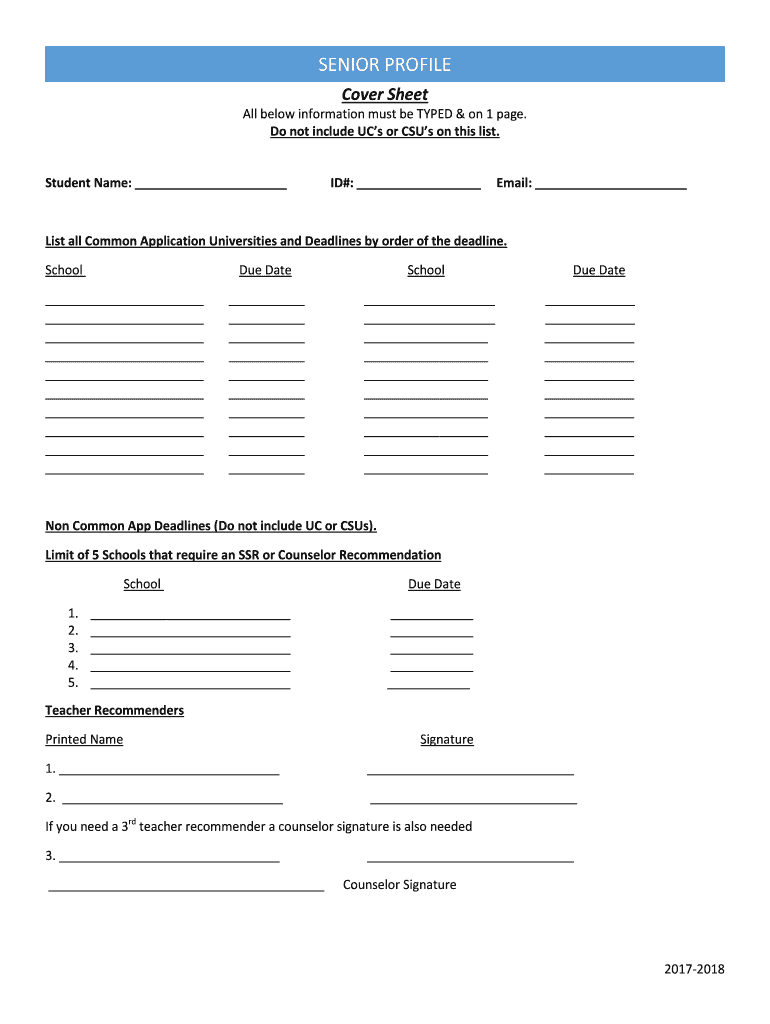 SENIOR PROFILE Cover Shall below information must be TYPED & on 1 page. Do not include UCS or CSU son this list. Student Name: ID#: Email: List all Common Application Universities and Deadlines by