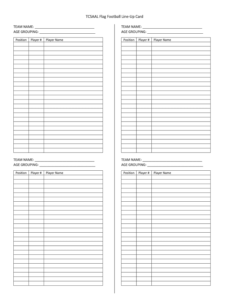 TOTAL Flag Football Lineup Card TEAM NAME: AGE GROUPING: PositionPlayer #Player Nameless NAME: AGE GROUPING: PositionPlayer #Player Nameless NAME: AGE GROUPING: PositionPlayer #Player Nameless NAME: