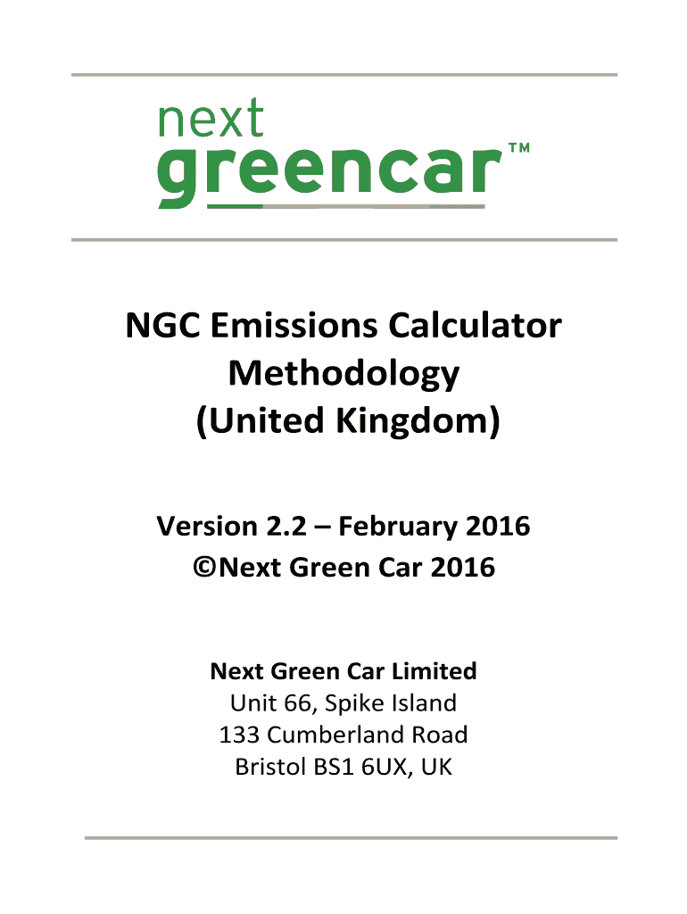 NGC Emissions Calculator Methodology (United Kingdom) Version 2.2 February 2016 Next Green Car 2016 Next Green Car Limited Unit 66, Spike Island 133 Cumberland Road Bristol BS1 6UX, UK NGC Emissions