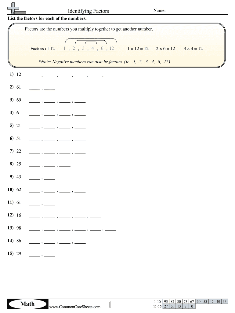 Name:Identifying Factors List the factors for each of the numbers. Factors are the numbers you multiply together to get another number.1, 2, 3, 4, 6, 12Factors of 121 12 122 6 123 4 12×Note: Negative