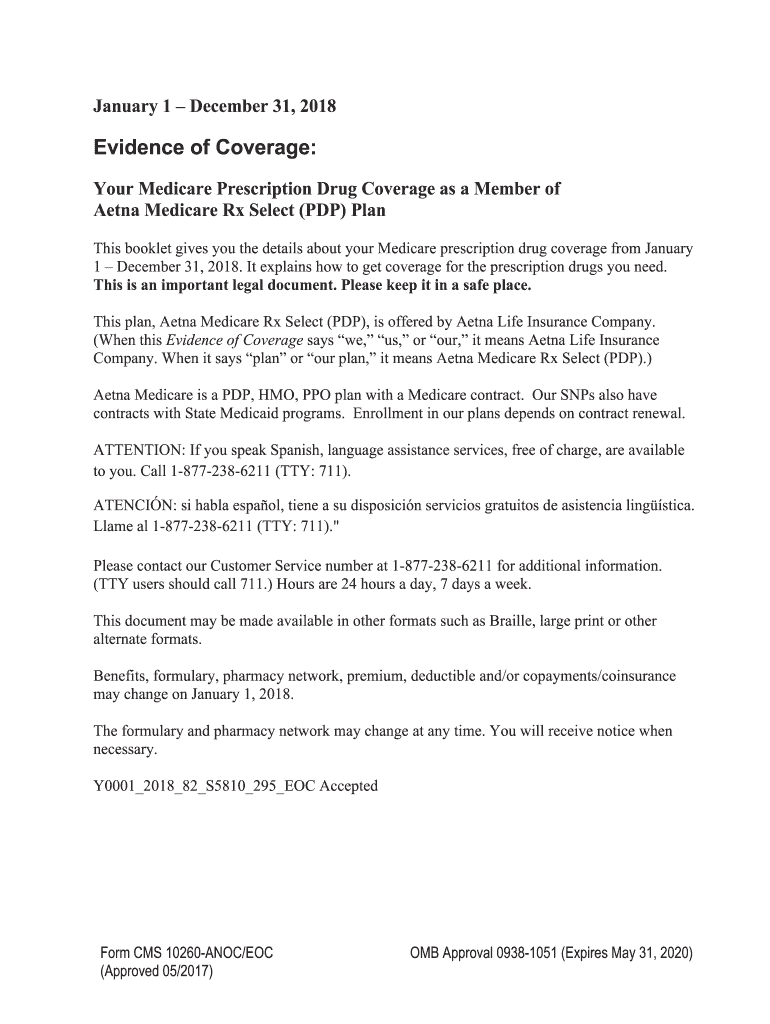 January 1 December 31, 2018Evidence of Coverage: Your Medicare Prescription Drug Coverage as a Member of Aetna Medicare Rx Select (PDP) Plan This booklet gives you the details about your Medicare