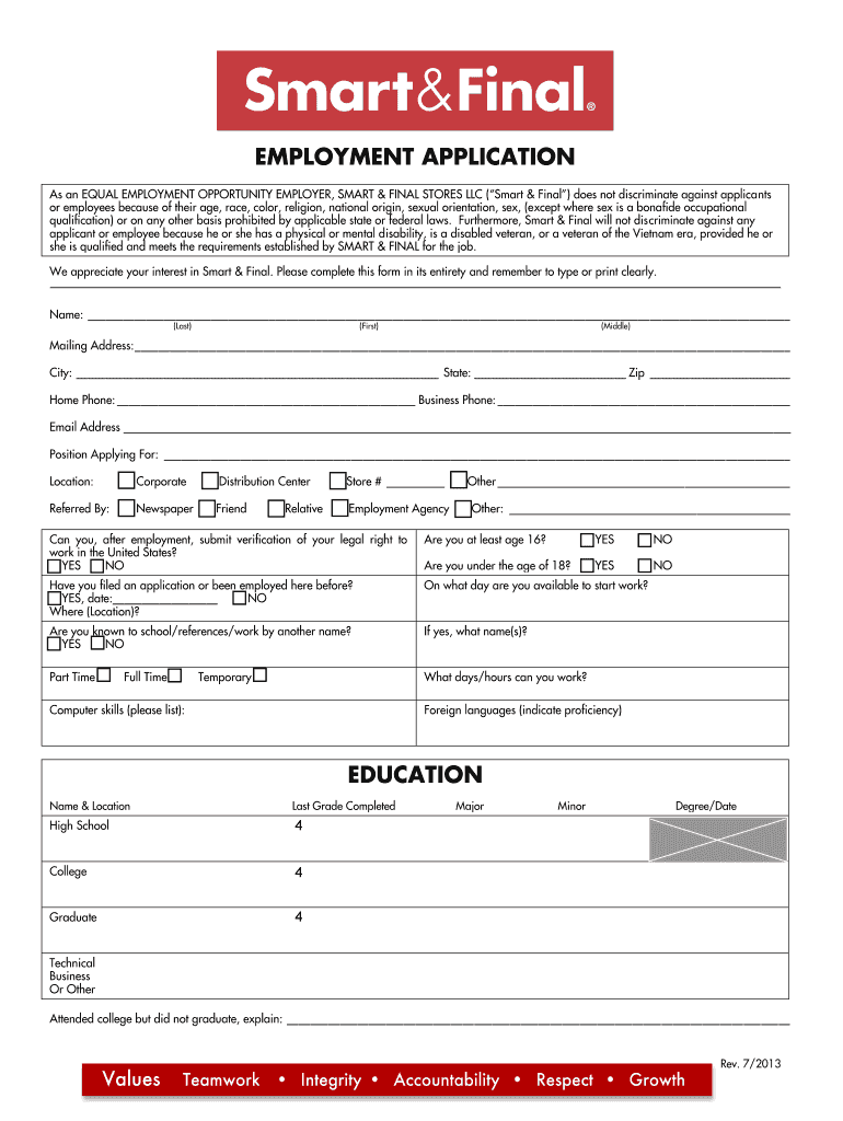 EMPLOYMENT APPLICATION As an EQUAL EMPLOYMENT OPPORTUNITY EMPLOYER, SMART & FINAL STORES LLC (Smart & Final) does not discriminate against applicants or employees because of their age, race, color,