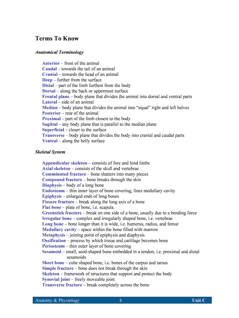 Terms To Know Anatomical Terminology Anterior front of the animal Caudal towards the tail of an animal Cranial towards the head of an animal Deep further from the surface Distal part of the limb furthest