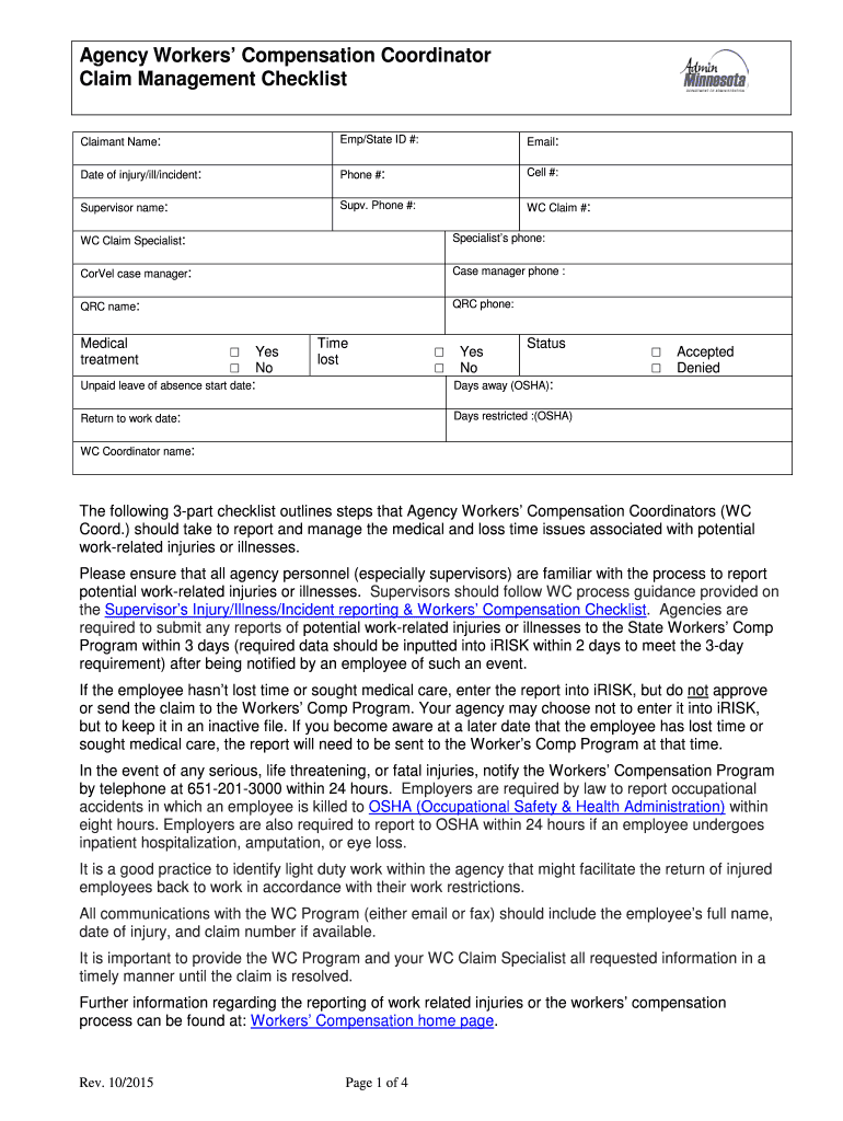 Agencies that have a significant number of employees or a high risk of workplace injuries may require a dedicated workers' compensation coordinator.