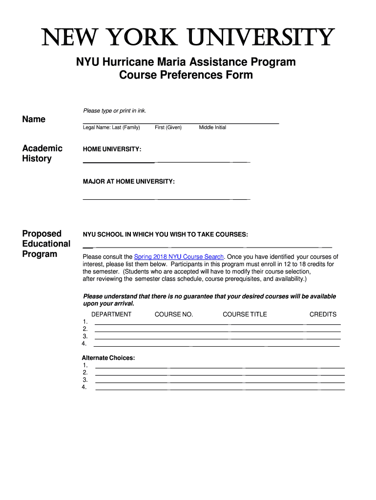 NEW YORK UNIVERSITY NYU Hurricane Maria Assistance Program Course Preferences Form Please type or print in ink. Name Legal Name: Last (Family)Academic HistoryFirst (Given)Middle Initialism UNIVERSITY: