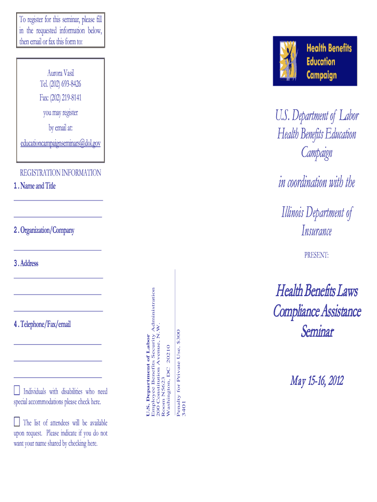 This document is a registration form for a seminar focused on health benefits laws compliance, organized by the U.S. Department of Labor and the Illinois Department of Insurance.