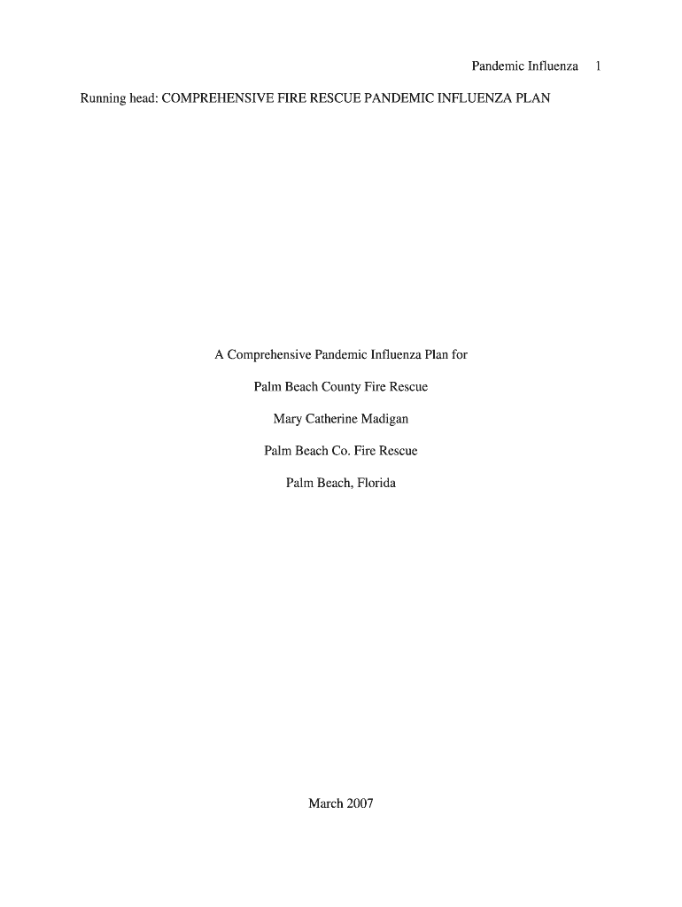 Pandemic Influenza Running head: COMPREHENSIVE FIRE RESCUE PANDEMIC INFLUENZA PLAN A Comprehensive Pandemic Influenza Plan for Palm Beach County Fire Rescue Mary Catherine Median Palm Beach Co. Fire