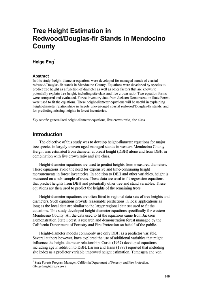 Abstraction this study, height diameter equations were developed for managed stands of coastal