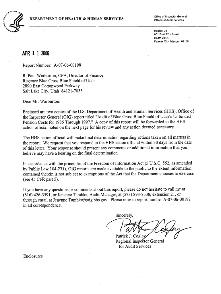 DEPARTMENT OF HEALTH & HUMAN SERVICES Office of Inspector General Offices of Audit Services Region VII 601 East 12th Street Room 284A Kansas City, Missouri 64106 APR 1 1 2006 Report Number: A-07-06-00
