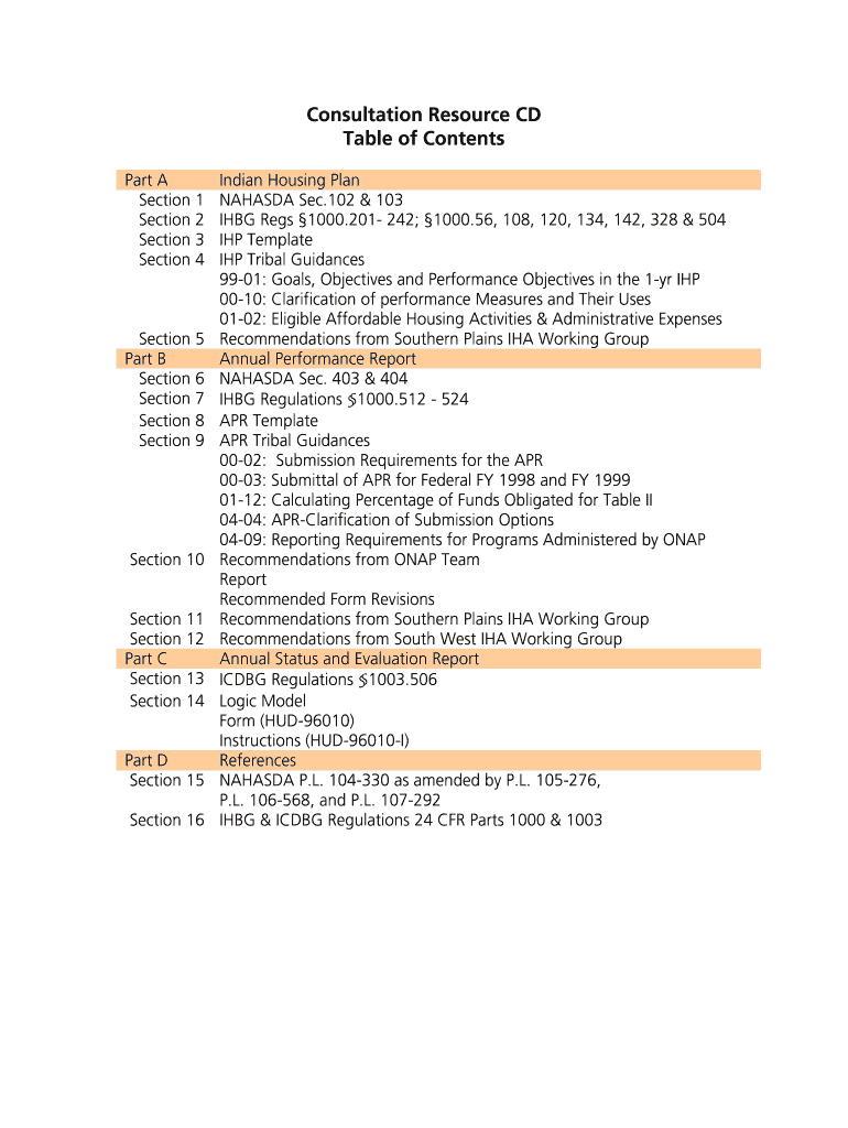Consultation Resource CD Table of Contents Part A Section 1, Section 2, Section 3, Section 4 Indian Housing Plan NATASHA Sec.102 & 103 IBM Reg's 1000.201 – 242; 1000.56, 108, 120, 134, 142, 328