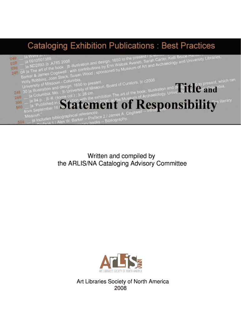 This document provides guidelines for cataloging exhibition publications, including best practices for titles, statements of responsibility, and subject heading assignment.