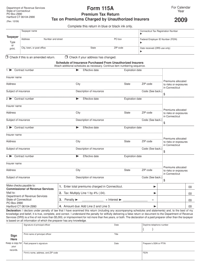 Department of Revenue Services State of Connecticut PO Box 2990 Hartford CT 06104-2990 (Rev. 12/09) Form 115A Premium Tax Return Tax on Premiums Charged by Unauthorized Insurers Complete this return
