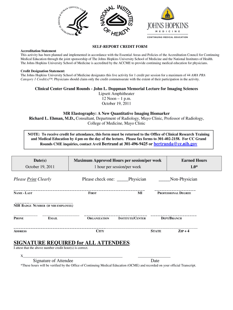 All attendees of the Clinical Center Grand Rounds - John L. Doppman Memorial Lecture are eligible to use the Self-Report Credit Form to claim their continuing medical education credits.