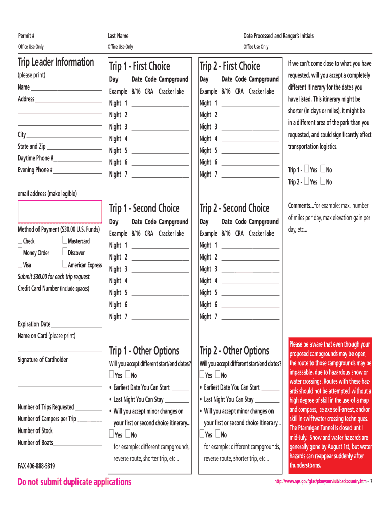 This form is primarily targeted at individuals planning backcountry trips, including hikers and campers within Glacier National Park. The trip leader plays a significant role in the application process, assuming responsibilities for the team's safety and compliance. Eligibility criteria and specific requirements may vary based on the trip type and size.