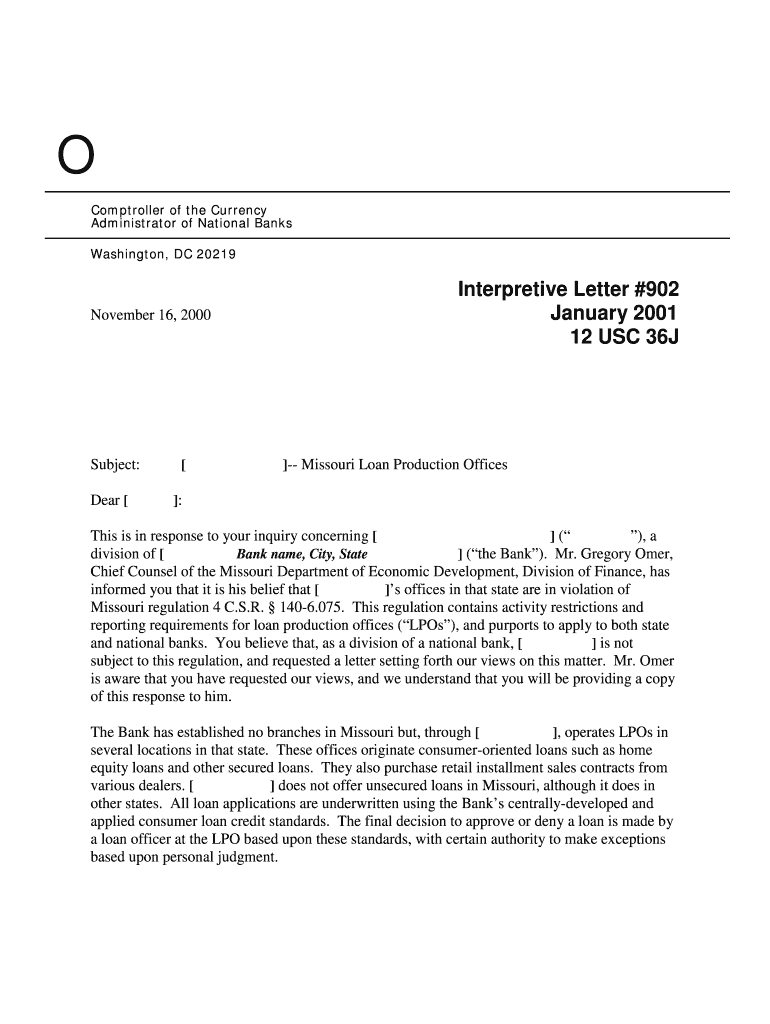 O Comptroller of the Currency Administrator of National Banks Washington, DC 20219November 16, 2000Subject: Dear Interpretive Letter #902 January 2001 12 USC 36J Missouri Loan Production Offices :