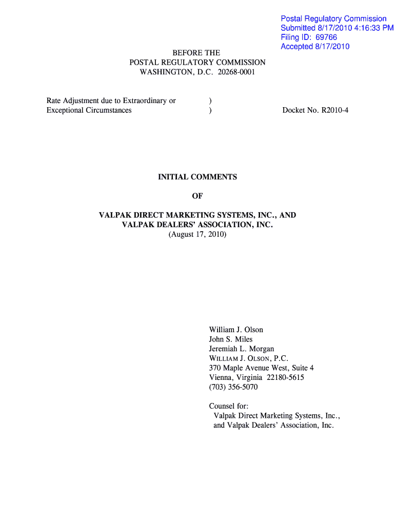 BEFORE THE POSTAL REGULATORY COMMISSION WASHINGTON, D.C. 20268-0001 Rate Adjustment due to Extraordinary or Exceptional Circumstances)) Postal Regulatory Commission Submitted 8/17/2010 4:16:33 PM