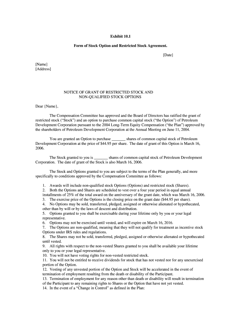 This document outlines the grant of restricted stock and non-qualified stock options, detailing the terms, conditions, vesting, and exercise rights associated with the granted stock and options.