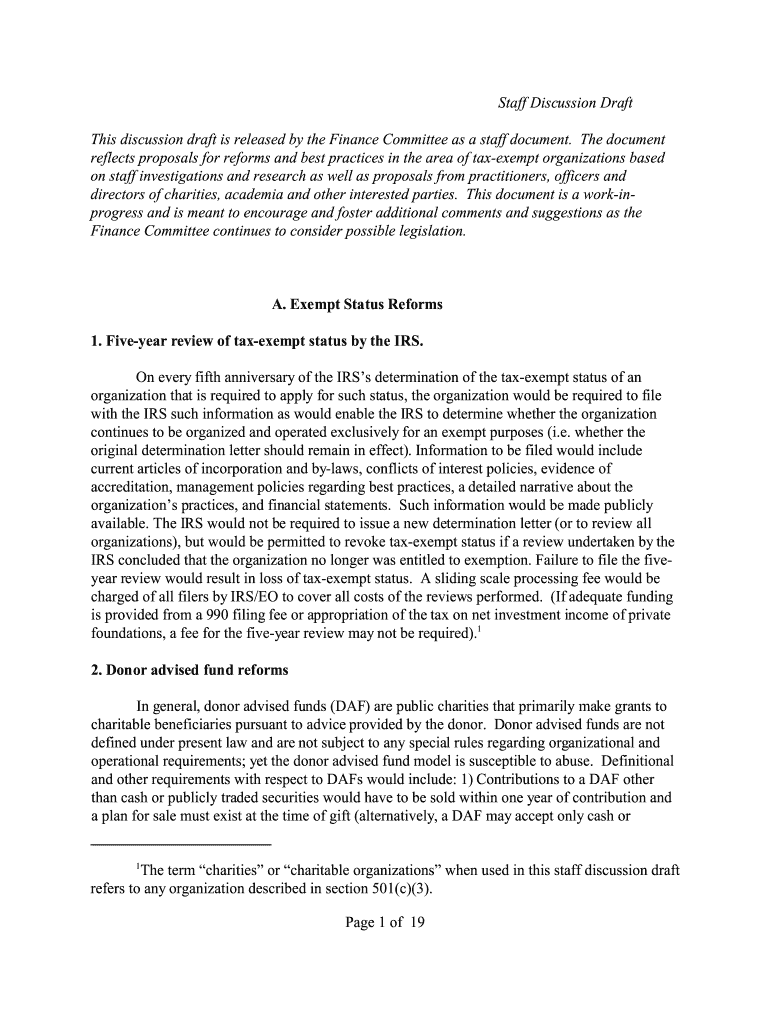 Staff Discussion This discussion is released by the Finance Committee as a staff document. The document reflects proposals for reforms and best practices in the area of tax-exempt organizations based