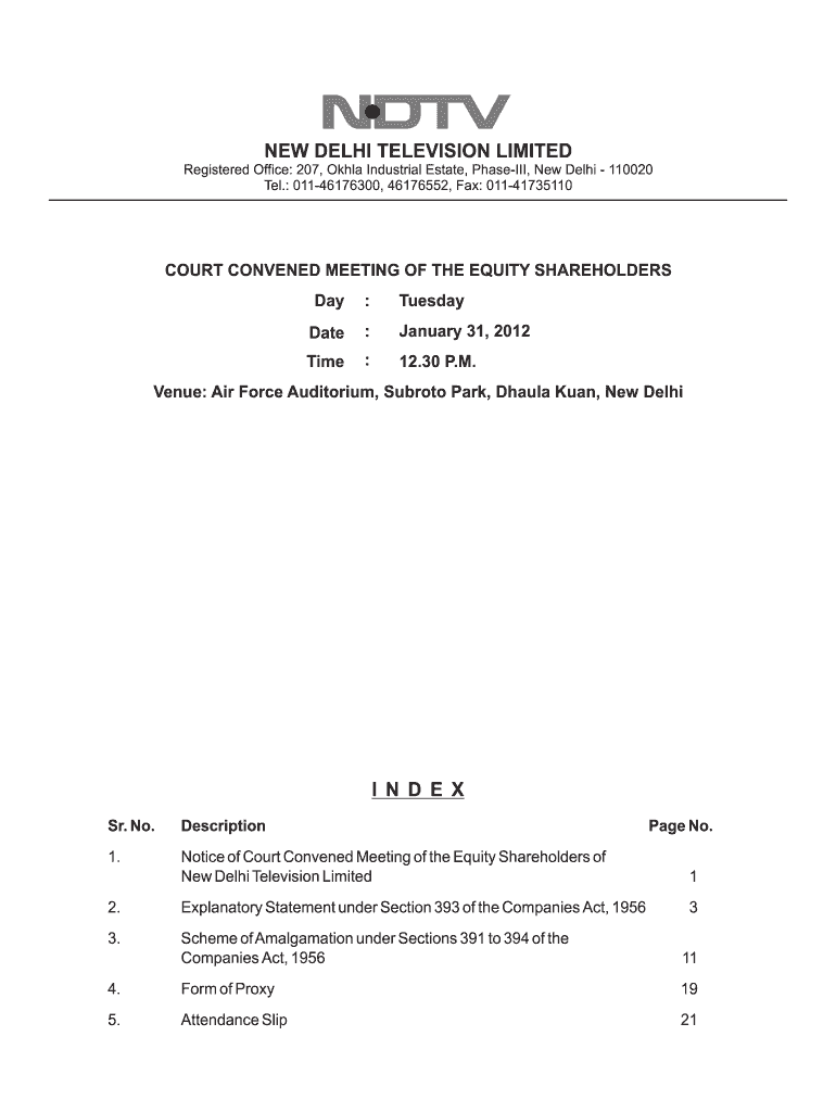 This document pertains to the court-convened meeting of the equity shareholders of New Delhi Television Limited scheduled for January 31, 2012, which includes notices, explanatory statements, and