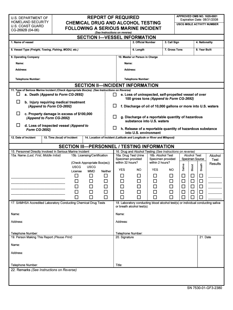 This document is used to report the results of chemical drug and alcohol testing for personnel involved in serious marine incidents as mandated by U.S. Coast Guard regulations. It includes details