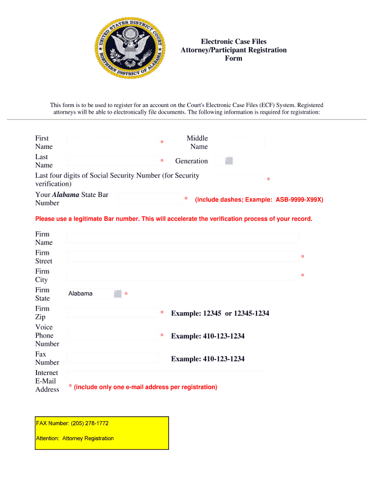 The Attorney Registration Form is intended for attorneys practicing in Alabama who plan to register for an account on the Electronic Case Files (ECF) System.