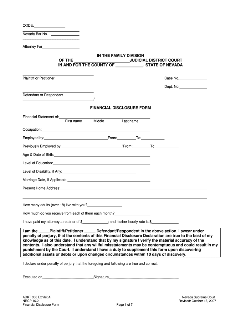 Oct 18, 2007 ... Financial Disclosure Form Instructions. 1. Nevada Rule of Civil Procedure 16.2 requires that this Financial Disclosure Form be filed and served ...