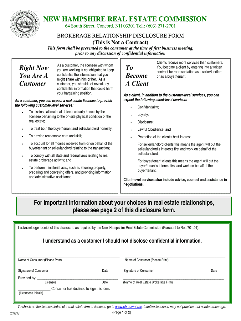 This form discloses the relationship between real estate licensees and consumers, outlining the services provided to customers versus clients, and ensuring consumers understand the implications of