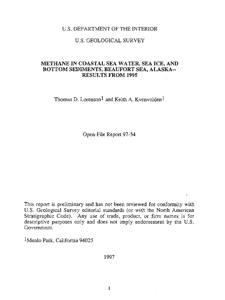 U.S. DEPARTMENT OF THE INTERIOR U.S. GEOLOGICAL SURVEYMETHANE IN COASTAL Seawater, SEA ICE, AND BOTTOM SEDIMENTS, BEAUFORT SEA, ALASKARESULTS FROM 1995Thomas D. Sorenson and Keith A. KvenvoldenlOpenFile