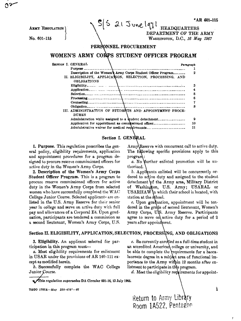 This document outlines the eligibility requirements, application process, selection criteria, and obligations for women participating in the Women’s Army Corps Student Officer Program to procure