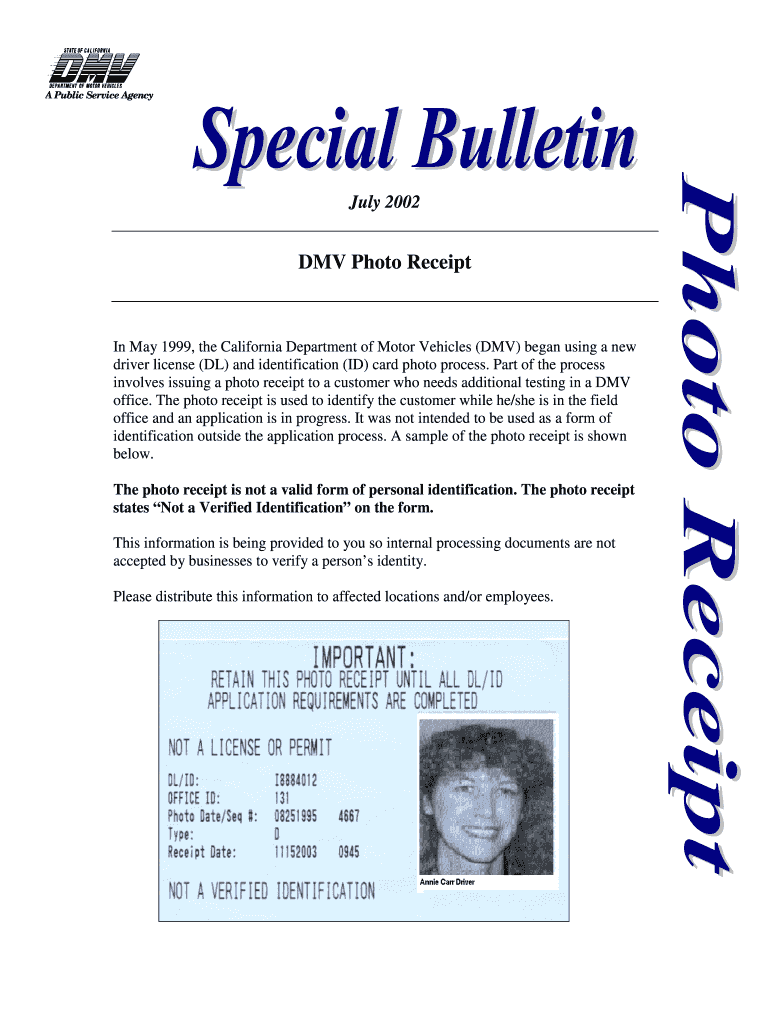 A Public Service Agency July 2002 DMV Photo Receipt In May 1999, the California Department of Motor Vehicles (DMV) began using a new driver license (DL) and identification (ID) card photo process.