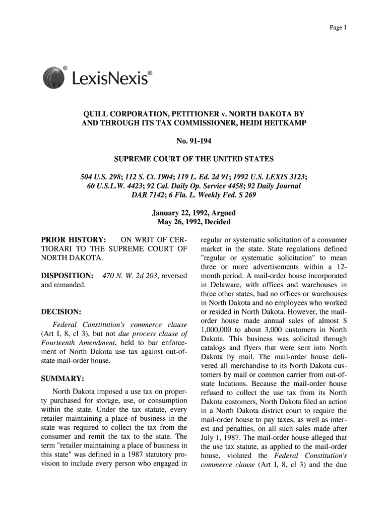 Quill Corporation Petitioner v. North Dakota is a landmark Supreme Court case that deals with interstate sales tax collection and the constitutional limits on state taxing authority.
